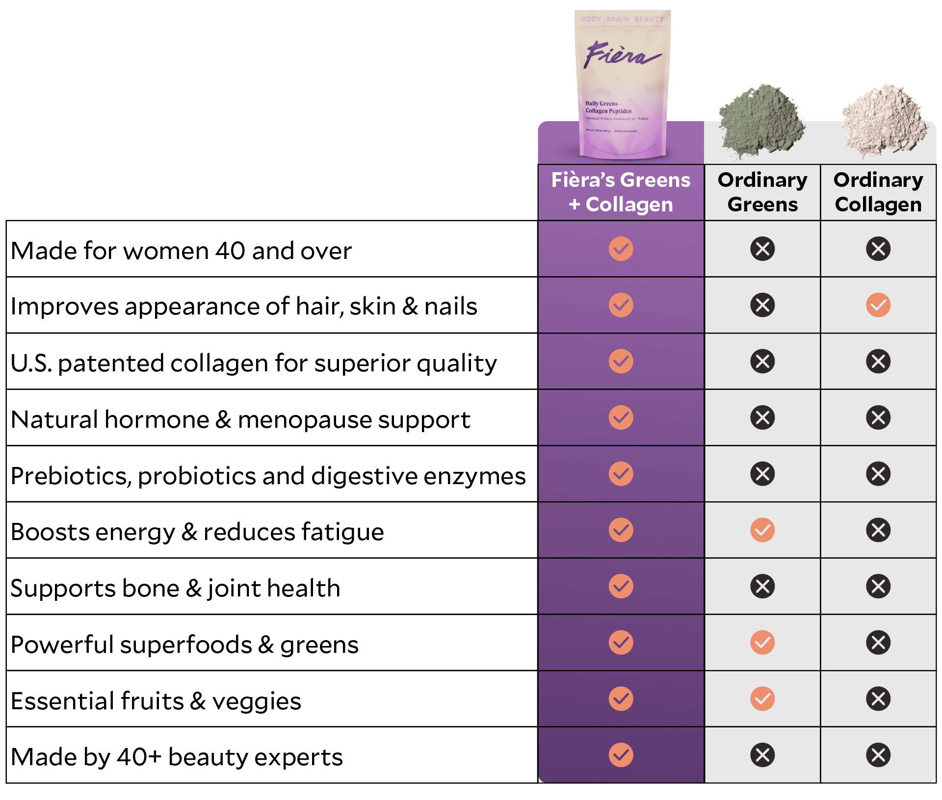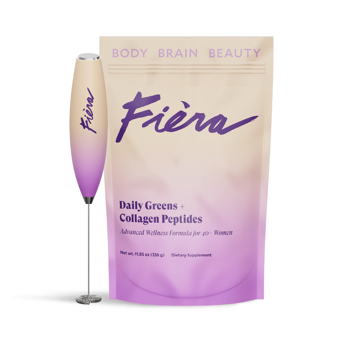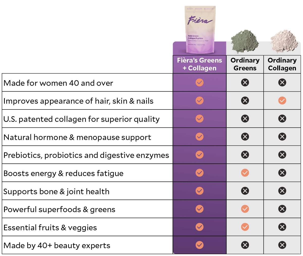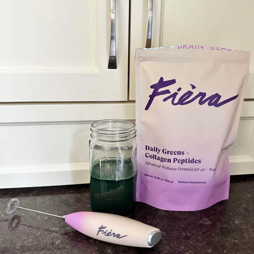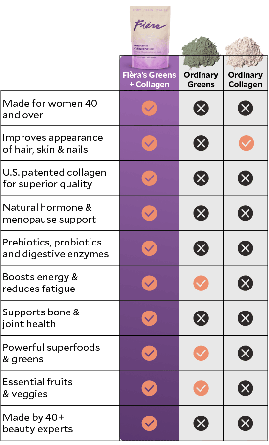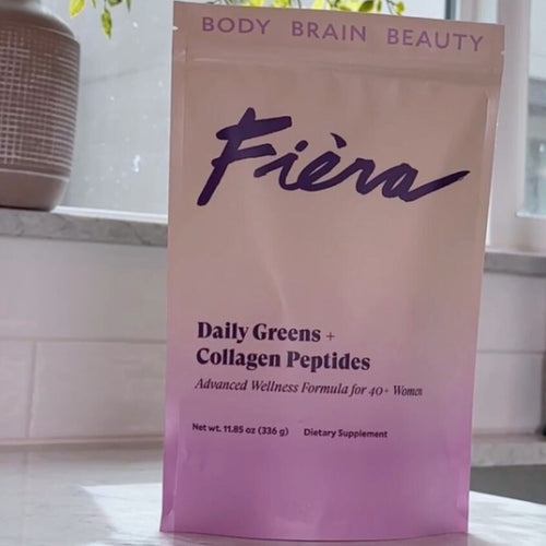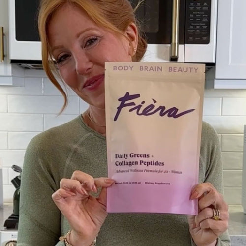 As a catalyst for enhanced beauty, health and wellbeing, Fièra Daily Greens + Collagen Peptides delivers incredible benefits in one delicious daily drink. Made to support women over 40 entering or going through perimenopause, menopause and post menopause and packed with 62 high-quality ingredients, this one formula can replace dozens of supplements; including multi-vitamins, greens, collagen, probiotics, digestive enzymes and more. Our formula also contains 15 fruits and vegetables chosen for their remarkable skin and health benefits crucial during all 3 stages of menopause.